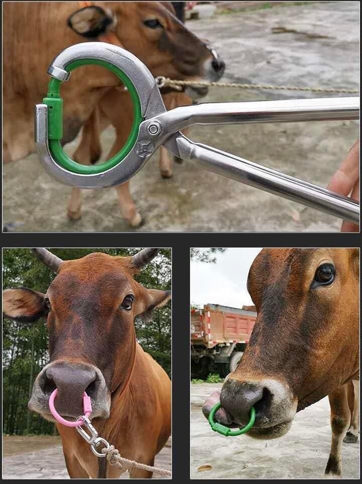 Kìm bấm mũi bò được làm bằng thép carbon, vòng xỏ mũi bò màu xanh lá . Phần mũi nhọn của vòng rất sắc, bén nên hỗ trợ thực hiện thao tác bấm mũi cho bò nhanh, ít gây đau, không cần dùng lực quá mạnh, không gây nhiễm trùng cho con vật. Vòng xỏ mũi là những dụng cụ hình tròn được làm bằng các chất liệu khác nhau như nhựa, inox. Được dùng để xuyên qua mũi của trâu, bò.